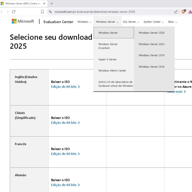 1. Acesse o site oficial da Microsoft para downloads do Windows Server na sua versão (2016, 2019, 2022 ou 2025) e edição (Standard/Datacenter).